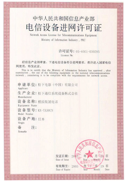 当前位置:首页 > 走进至泰 > 资质荣誉 > 松下模拟集团电话KX-TA30CN电信设备进网许可证