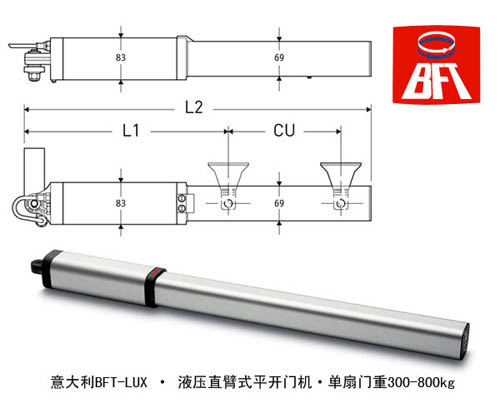 BFT-LUX液压臂式平开门机,单扇门大推力300KG-800KG。由意大利BFT开门机公司原厂生产,含电机LUX液压臂式开门机两台,外置控制一个,原装BFT开门机遥控器2个。